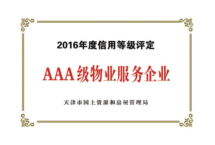公司目前被授予:中國保安協(xié)會理事單位、物業(yè)管理綜合實力入圍企業(yè)、天津市物業(yè)協(xié)會理事單位、天津市保安協(xié)會常務理事單位、天津市保潔協(xié)會明星企業(yè)、天津市科技小巨人企業(yè)、天津市科技型企業(yè)、天津市物業(yè)管理企業(yè)優(yōu)秀項目經(jīng)理、企業(yè)信用評價體系AAA級企業(yè)、AAA級誠信經(jīng)營示范單位、AAA級重合同守信用單位、2017年被天津市工商業(yè)聯(lián)合會評為天津市民營企業(yè)促進就業(yè)百強企業(yè)、社會捐贈百強企業(yè)、2018年銷售收入百強企業(yè),2020年被天津市退役軍人事務局評為天津市吸納退役軍人就業(yè)先進單位。